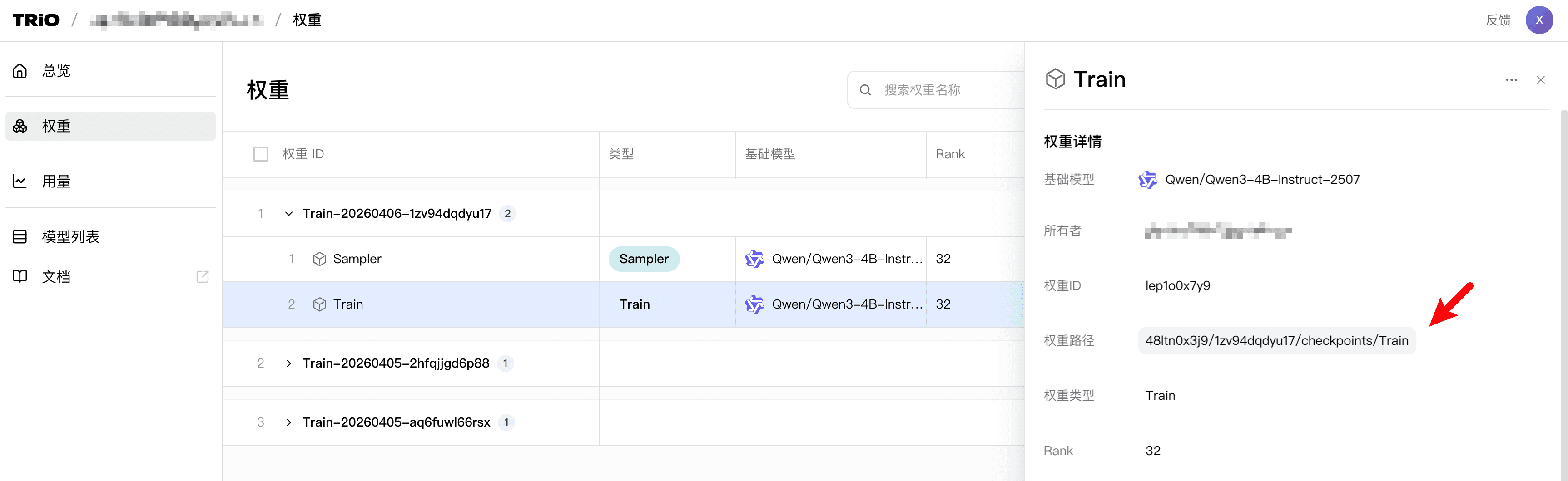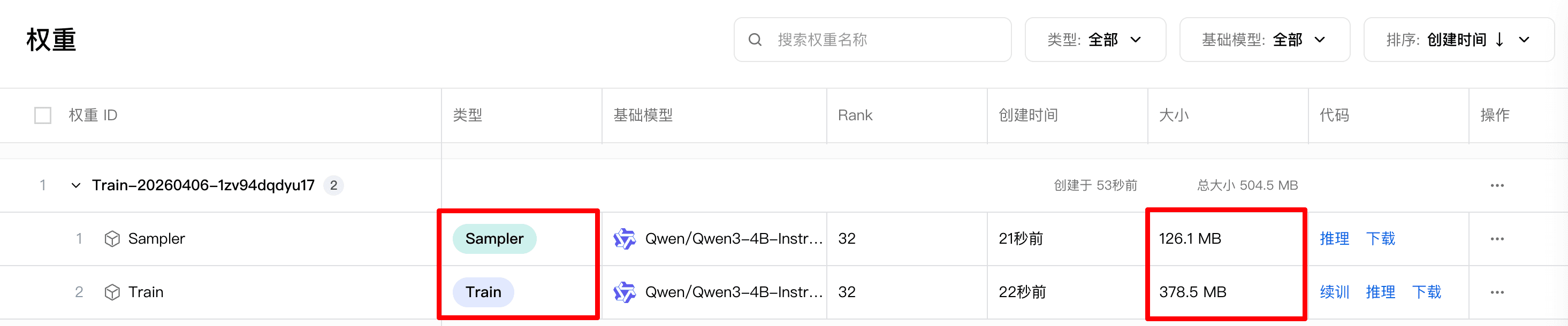 training_client.save_state(name="train")这样保存的权重,在WebUI的类型上会显示为「Train」,并拥有比「Sampler」类型占用更多的空间(因为保存了优化器状态):